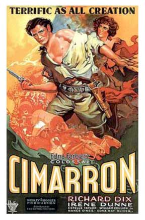 (Editors notes: The original Cimarron (1931, was based on Edna Ferber’s novel Cimarron picking up three Academy awards. Blacks, Jews, Indians: all hit to the stereotypes typical of the era. “Sabra Cravat refers to American Indians as "dirty, filthy savages" and refuses to allow her son to accept a gift of feathered headgear from a Cravat, has a more sympathetic view, acknowledging that the Indians in the back of the church are not expected to give a monetary contribution to the purchase of a white man's church organ as they have had their land stolen by the white men.” “Yancey's open minded view of non-whites contradicts his urges to participate in claims for newly opened land in the West bought by the government from the Cherokees for far less than its market value – the "Oklahoma Land Rush." Calling the Cherokees dirty savages was bad but stealing their land was good.