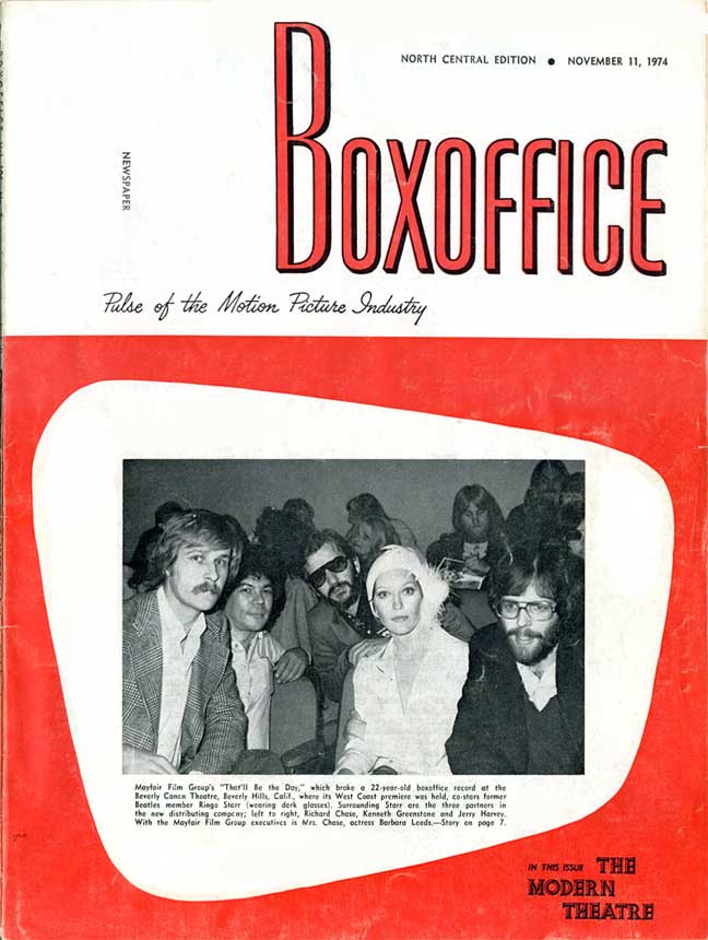 Fans crowded outside the filled theatre for a glimpse of Ringo, ex-Beatles drummer, who attended the West Coast premiere. Also attending the opening were rock stars Keith Moon, drummer for the Who with a cameo role in the film, Harry Nilsson and Ted Neely, star of Jesus Christ Super-Star. Contributing to the showmanship of the occasion, ushers, cashiers, concessionaires and ticket takers dressed in 1950 teenage attire, the movie being a look at the English 50s rock scene and the making of a rock star. For his performance in That’ll Be the Day, Ringo as been suggested for an Oscar for the best supporting actor. Careful attention and individual handling mark the Mayfair Film Group’s initial success, according to Richard Chase co-director with Ken Greenstone and Jerry Harvey. For us there’s no product shortage Chase noted. It’s not necessary for use to release more than five or six pictures a year. We’re not taking nickel and dime movies. All the pictures that we’ve acquired have tremendous critical support and we think that’s important.