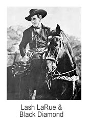 had never handled one, so after he was cast he ran out and borrowed a whip. He spent the next several days trying to learn to use it, but wound up beating himself senseless and bloody, and was finally forced to admit to Tansey that he didn't know what he was doing. Impressed by LaRue's sincerity and laughing at his injuries, Tansey arranged for personalized bullwhip instruction, a rather lavish expense for penny-pinching Producers Releasing Corporation. This picture was also unique in being PRC's first western to be shot in color, albeit in Cinecolor, a process favored by low-budget producers because it was much cheaper than the better known (and more garish) Technicolor, even though it was decidedly inferior and gave films shot in it an anemic, washed-out look. Although he wasn't the star, and billed as "The Cheyenne Kid," LaRue received a relatively large amount of fan mail and it dawned on the powers-that-be at PRC that they had a potential star on their hands. Not wanting to mess with a good thing, the studio paired the whip-cracking LaRue with the singing Dean two more times before splitting them off into their own pictures. LaRue quickly adopted an all-black wardrobe and rode a jet black horse to accentuate his image as a bad guy/good guy, sort of an early western anti-hero. He became "King of the Bullwhip" and a solid staple of Saturday-afternoon matinées. Despite having one of the more recognizable names in B-westerns, he never ranked among the top stars in popularity polls, probably attributable less to his screen persona or acting ability and more to his films' awful scripts and deplorable lack of production values due to PRC's legendary cheapness, a factor that hurt the careers of many of the studio's western stars. LaRue almost always performed his own stunts—mainly because PRC was loathe to spend money on professional stunt men, who in those days demanded higher pay than the stars they were doubling for—a fact he took pride in and made sure that he "conveniently" lost his hat during action scenes so his audience could see that it was actually him in the fray and not a stunt double. He is credited with 40 actor parts in film and 28 parts in his own TV series Lash of the West (1953). This 15-minute show consisted of cowboy actor Lash LaRue introducing clips from his old films and occasionally bringing on a guest, usually an actor who appeared in one of more of his pictures. And there were Lash LaRue comic books. The first issue was quarterly, then bimonthly, then monthly. Then came a comic called Six Gun Heroes which featured Lash LaRue on the cover more than fifty percent of the time. "I used to get royalties from the comics which bought me a new car every year-—a Cadillac. I grew up a poor boy—I had to find out what you could do with money."