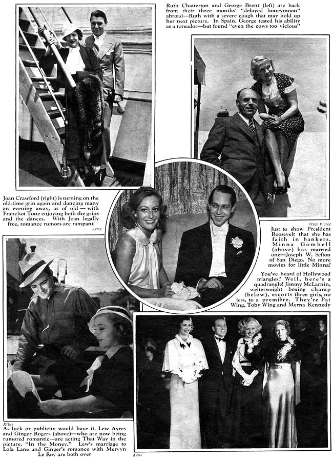 Charlie may even go cruising to the South Seas in the sixty-foot yacht, although his picture making will probably claim him before this comes about. Fantastic stories have been circulated that he and Paulette Goddard are already married and will be separated and divorced at some stopping place on the voyage. The tale of their being wedded is widespread, the ceremony supposedly having occurred somewhere in mid-ocean. But this seems to be pretty much of a fable, and is met only with denials or light evasions by the two principals. Their close friends, who may or may not know anything, doubt the truth of the legend.