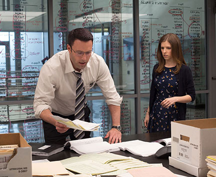 transitions, Affleck and Kendrick getting acquainted while eating homemade lunches outside the company tower—a scene well-designed to reveal character and conflict visually, from Affleck’s social ineptitude to Kendrick’s awkward vulnerability. Facial gesture, physical posture, camera position, ambient surroundings—the elements imply levels below the main story. You want to know more about these two and hope things work out.