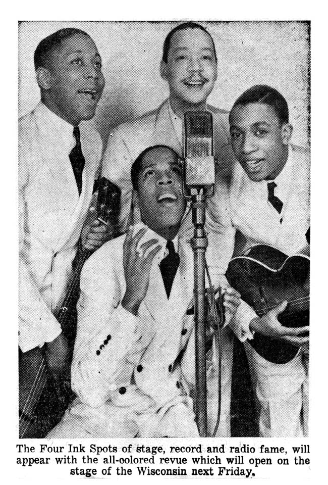 Typical of the times, the theatre ran both shows and movies. The Four Ink Spots was one of many nationally known artists to appear on the stage of the Wisconsin theater. Harry Holloway headed up the Milwaukee Sentinel Talent Quest as one of the stage shows.