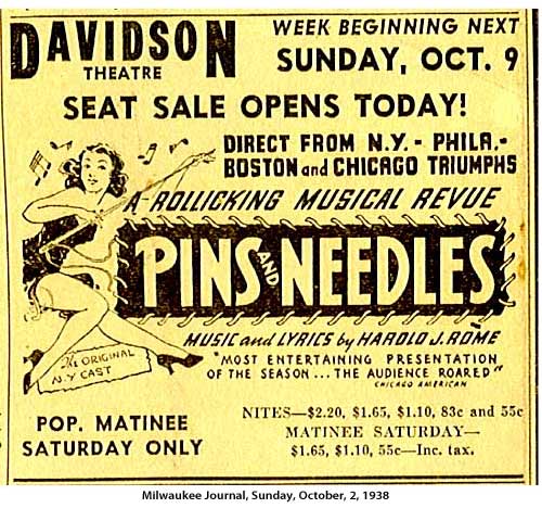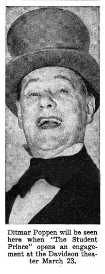 in “The Masked Ball,” Maude Adams was playing opposite him. John’s sister, Georgie Drew Barrymore, starred in “Mr. Wilkinson’s Widow,” hardly foreseeing that her three children, Lionel, Ethel and John, would be on that same stage many times in the years ahead. Her husband, Maurice, along with Holbrook Blinn, was only a supporting player to Marie Burroughs in “The Battle of the Strong.” As the 20th century moved along, the Davidson’s stars and dramas formed a galaxy. There were 30 to 40 road shows a year, and a summer-stock company, too. Pauline Lord was a particular favorite of the stock audiences. A glance through the programs reveals William Gillette in “Sherlock Holmes,” Olga Nethersole in the wicked “Sapho,” James (father of Eugene) O’Neill in “The Count of Monte Cristo,” De Wolf Hopper, Ditmar Poppen in "The Student Prince," Dustin Farnum, the four Cohans, Henry B. Walthall, David Warfield, Minnie Maddern Fiske, and so on, right up to Katharine Hepburn, Melvyn Douglas, Edward G. Robinson and Van Heflin (the latter four returning to the stage from Hollywood). The wheel had come full cycle before the wreckers moved in on March,1954. A department store and hotel firm, which owned the site, found a more profitable use for it. The Davidson’s final attraction was the Canadian National Ballet Company” Theatre Arts (magazine) , April 1958, Famous American Theatres by Walter Monfried, Theatre and Music Editor of the Milwaukee Journal. Back to HISTORY topics