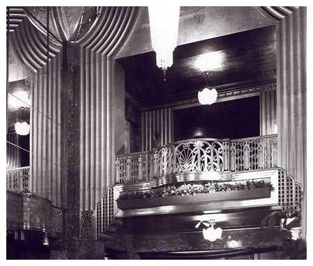 An overview from the balcony grande staircase landing originally held a baby grand and a duet of violins to entertain the waiting throng on the patterned terrazzo floor below (fully carpeted not long after opening). This almost pure Art Deco space is illuminated by two giant chandeliers of concentric sheaths of etched glass, with matching five-foot-tall sconces on the marbled piers under the silver-leafed plaster of the geometrically molded ceiling.