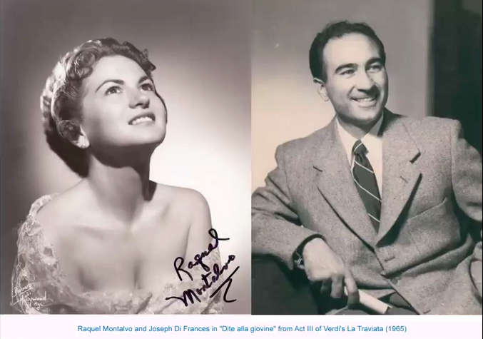 Metropolitan Opera in New York. I spotted him having breakfast. Opportunity. I walked over. He was holding up a newspaper that he was reading. “Sing something for me”. Back came the reply “go away”. But you sang lead roles at the Met. With that a very pretty young lady sitting one table over joined in. “I know the Met. You never sang there”. Down snapped the newspaper. He turned to her. “Give me your hands”. With that he softly started to sing her a love song in Italian. By the end his voice was at a level that could fill a mega-sized theater with no amplification. That brought a round of applause. And the girl, well her face was a bit flushed. With that the newspaper went back up. From behind it came a voice “now will you leave me alone”? (Listen to "Dite alla giovine" from La Traviata sang by Joe Di Frances and Raquel Montalvo, 1965)