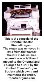Milwaukee was blessed with more than the average of highest quality theaters such as the PABST, WARNER (last open in '95 as the GRAND Cinemas, now being eyed by the Milwaukee Symphony), EGYPTIAN, and, of course, the ORIENTAL. Such theatres, aside from the PABST, were built to showcase the craze of the silent films and each therefore had provision for a small orchestra to accompany the film as well as a special theater pipe organ for matinees and preludes. The extra large Kimball brand organ was removed from the former WARNER when that theater was divided in 1973 and later installed and greatly enlarged in the ORIENTAL (the much smaller Barton organ originally there had been sold many years ago.) The majestic, yet very sweet sounds of this three manual, 38-rank (voice) "one man orchestra" can still be heard there several times a year, courtesy of the Kimball Theater Organ Society.