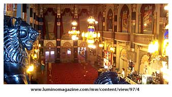 h in feeling than East Indian but the charming walkway formed by the ticket foyer is now introducing us to some of the elaborate stained glass light fixtures and stucco walls we will enjoy beyond those doors to the Grand Lobby. As the door is opened, we are greeted or should say overwhelmed by the lavish but gracious spectacle before us; a truly Grande lobby which many larger cities would wish for their downtowns, and we have it in a neighborhood! What do your eyes see first… the three eight-foot-high brass and bent glass chandeliers with their eight matching sconces blazing with light? If so, you will see some of the finest glass and metal work custom built by Milwaukee's Chas. Polacheck & Bros. Co. From the attic, manual winches lower these heavy fixtures.