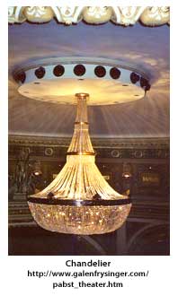 The attention to luxurious decor and comfort was not absent in the rush to a fireproof theater, and the idea pioneered at the Stadt of having names of notables inscribed about the cornice of the drum shaped auditorium was enlarged upon in the Pabst to act as a visual tribute to the Stadt. The dominant ornament was the statue of Apollo some seven feet high flanked by the muses of Drama and Song upon the apex of the proscenium arch, all in gold leaf. Fourteen boxes flanked the stage allowing the local 'beer peerage,' as one wag put it, to dominate the evenings in regal splendor. To enhance that splendor and cause the ladies' diamonds to sparkle was the task of the innovation of unusual lighting. Since only dim carbon filament bulbs existed at the time, provision was made for over a thousand of them to adorn the balcony and gallery fascias, the dome, and other fixtures; but these would still provide only soft light that complemented the ladies' complexions. What was needed was brilliant lighting to sparkle diamonds and show off the hand wrought gold metal thread tiebacks upon the deep maroon velvet hangings and the richly tasseled gold house curtain on the stage, so eight carbon arc street lamps were installed above a 16-foot diameter circle cut in the theater's dome and below which was hung a "bowl" or "veil" of crystals to scatter the brilliant white light. Imagine the dazzling brilliance as the gorgeously coifed and gowned ladies with their gloved arms upon those of their men in evening dress and top hats promenaded into the auditorium and took their seats as the bright white light extinguished and the glowing quality of the little light bulbs remained until d