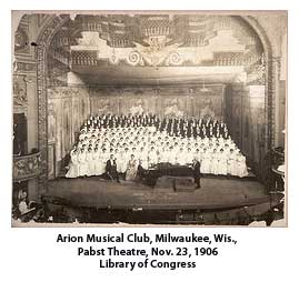 For years this handsome Grand Opera House served the various ethnic groups in the city, but by 1890 the need for a larger site for the German's theatre led Frederick Pabst, late of a captaincy on the great lakes steamers and now head of the brewery bearing his name, to purchase the opera house and drastically remodel it upon the same footprint, and christen it Das Neue Deutsche Stadt Theater (or: The New German City Theater, as the main such theatre in a city would be called in his native Germany). The original Stadt Theater had stood where the parking lot for the Hyatt Regency hotel is now on Third Street. Originally, this new Stadt theater was to be of a revolutionary design by famous Chicago architects Adler and Sullivan, but apparently the tradition minded burghers of Milwaukee, who made up over sixty percent of the city's population at that time, were taken aback by such a nontraditional design and persuaded the Captain to hire a local man more familiar with local tastes. It was then given to Carl G. Hoffmann in conjunction with local panorama scenic painters such as Georg Peter to design and decorate in a Germanic flavor complete with the names of German notables of the arts painted in ornate frames upon the archivolt of the auditorium, a device later expanded in the Pabst to literati of other nations as well.