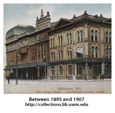 While the Pabst is not the oldest extant theatre in Milwaukee County (that honor belongs to the Ward Memorial Theatre of 1881 on the Veteran's grounds, the former federal enclave of Wood, Wis.), it is the fourth oldest continuously operating theatre on the same site in the United States, and that is one of the distinctions that led to it being designated a National Historic Landmark of the US in 1991. That site was at first a shipyard along the Milwaukee River and the eastern portion a black smith's shop, but when Swiss immigrant Jacob Nunnemacher and his sons sought a site for the first classy opera house in the city, it was here that they started construction in 1870. Ironically, these entertainment pioneers were in the same business as that of the Pabst brewery, libations.