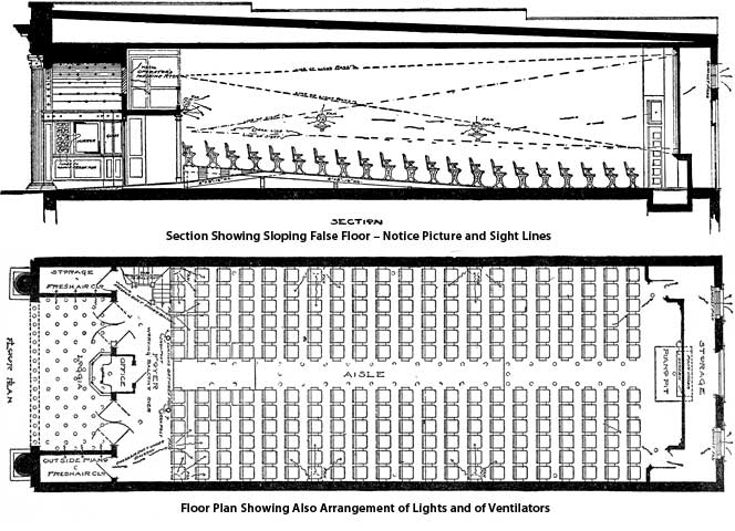 ung so as to open out. The store front is always removed and the room closed in with a partition placed about 14 feet back from the front. This gives the wide vestibule which is so necessary in an attractive place. The floor plan shows a good arrangement for an up-to-date moving picture house. Note that each aisle is marked by a small red light placed under glass in the floor. The piano pit is placed below the level of the floor to keep the player out of the line of vision. The sectional view gives a good idea of the raised floor, balcony and ticket office. It will be noticed that the three rows of seats at the rear are above the level of the main aisle.