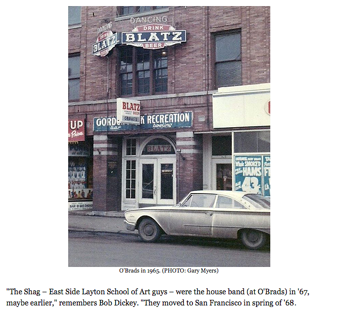 What a great article. I remember sneaking down the stairs of O'Brads to catch a glimps of the strange people and hear all this weird music. Sometimes they would even let me stay for awhile at the bottom of the stairway where everyone was greated by a bouncer. I think I was maybe 13 or 14 years old at the time. There also were 2 other local bands that played some weird music, The Corporation and The Velvet Whip. All this weird music stuff soon became the new hip thing and it wasn't long before this one hippy DJ named Bob Reitman started playing all this stuff at a radio station called WTOS. The rest is history. Along came The Doors, Fleetwood Mac, Jefferson Airplane, The Cream etc, etc. Thanks for sending this off to me. It was fun reading. Wishing you a VERY Prosperous New Year and Good Health. —Damian and the Bride.