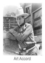 Art Accord (1890-1933) born in Oklahoma Territory. By nine years old he was a full time wrangler on a ranch, entering rodeo competition as his riding skills increased. He was picked up by the by The Dick Stanley-Bud Atkinson Wild West Show (1909) to perform the daring riding stunts for which he had become famous.