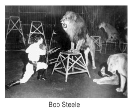Clyde Beatty started the Clyde Beatty Circus (1944) a huge endeavor traveling by rails and featuring the best performers in the world of the circus. Bob Steele was featured with the circus during the early part of the 1950 season. Beatty became famous for his "fighting act," in which he entered the cage with wild animals with a whip and a pistol strapped to his side. The act was designed to showcase his courage and mastery of the wild beasts, which included lions, tigers, and hyenas, sometimes brought together all at once in a single cage in a potentially lethal combination.