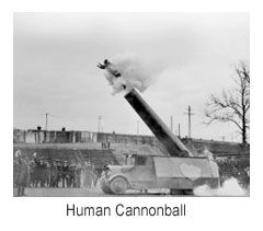 ight wire in the back yard, practicing on a high trapeze or else riding a bicycle on the tight wire that extended from one clothes post to the another. The cannon act started when Victoria’s father, Edmund, got the idea that shooting someone out of a cannon was a great idea. The first gun that he build shot a man only ten feet – then very daring. Each cannon that he built pushed the limit a bit further finally shooting the Zacchinis 100 feet and more. In 1929 the Ringling Brothers contracted to bring Hugh and Bruno to America. In 1931 Edmond made a cannon that shot Victoria over two Ferris wheels, a 175 foot stunt. The big gun “booms”, she hurtles out through a burst of flame and sails over an arc about 175 feet into a net some two and one-half seconds later.