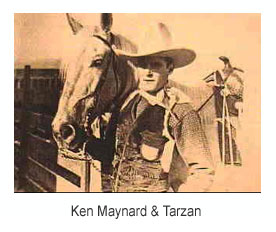Ken Maynard (1891-1978) Working at carnivals and circuses starting at age 16, Maynard became an accomplished horseman. As a young man, he performed in rodeos and was a trick rider with the Kit Carson Buffalo Ranch Wild West in 1913 and Ringling Brothers in 1914. He first appeared in silent movies in 1923 (for William Fox) and in addition to acting, he also did stunt work. His horsemanship and rugged good looks made Maynard a cowboy star. His white stallion, "Tarzan", also became famous. He became one of the first singing cowboys with Columbia Records, recording two songs,