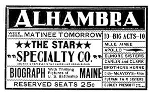 According to the "Music and Drama" section of the March 26, 1898, Milwaukee Journal, high-class vaudeville is recognized by the theater-going public as the most popular form of amusement now in vogue, nor is there any reason why this should not be so. A vaudeville programme is made up to afford the greatest amount of pleasure to the greatest number... the most appropriate and popular number on the [Alhambra's] bill is that marvel of perfection in instantaneous photography, the American Biograph with panoramic pictures of the ill-fated battleship Maine as she lay in New York harbor prior to her disastrous trip to Havana. Alongside of her lies the Massachusetts, the two noble vessels making an inspiring sight to all patriotic citizens. Another picture of interest to all in these times of contemplated war is that taken of the Spanish warship Viscaya, while steaming