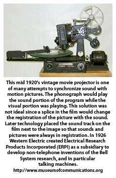 It is thus not so much the technology that changes with the Vitaphone system that precipitated Hollywood's conversion to sound in the late Twenties. After all, even though it benefits from Bell Laboratories' advances in electric recording and amplification, Vitaphone is still nothing more than an improved version of the dozens of sound-on-disc systems popular around 1910. Important changes had come not in technology alone, but also in audience expectations regarding sound. No longer was speech the film accompaniment of choice. Instead, discs were called upon to provide the expected musical support for films that continued to carry speech on intertitles.