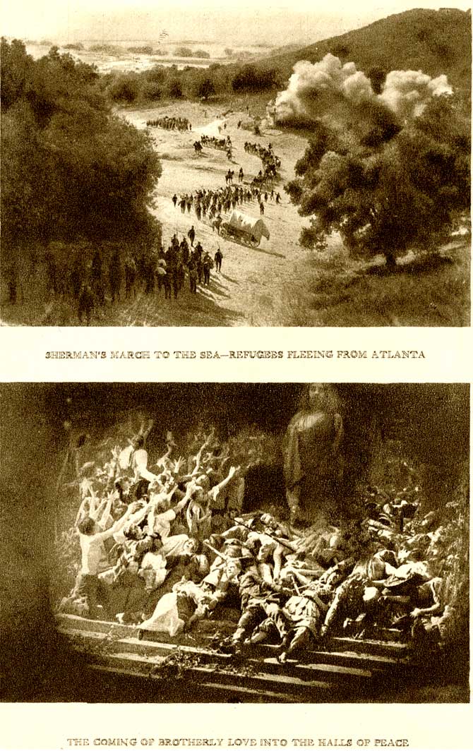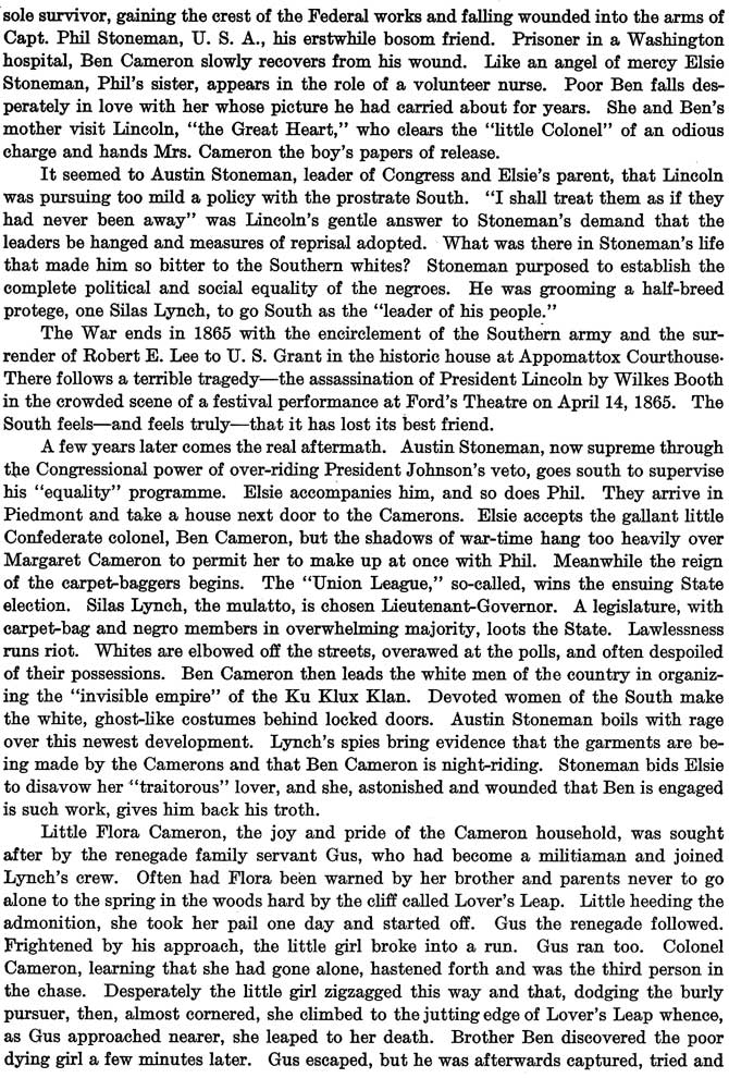 The Stoneman boys visit the Camerons at their South Carolina estate, a pinnacle of the Old South, and all it represents. The eldest Stoneman boy falls in love with Margaret Cameron, and Ben Cameron idolizes a picture of Elsie Stoneman (Lillian Gish). When the Civil War begins, all of the boys join their respective armies. A black militia (with a white leader) ransacks the Cameron house, attempting to rape all the Cameron women, who are re