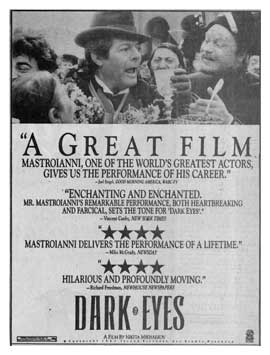 Dark Eyes (Italian Dark Eyes 1987 movie, Russian Очи чёрные) came out of an adaption from a series of stories by Anton Chekhov (Russian). Some in Russia felt that director Mikhalkov, who previously received wide acclaim for another Chekhov adaptation, tried too hard to cater to foreign tastes rather than to convey Chekhov's mood. So this film conveys more of a foreign idea what Chekhov is about rather than a Russian one. Chekhov’s career as a dramatist produced four classics and “is considered to be among the greatest writers of short stories in history.” “His originality consists in an early use of the stream of consciousness, combined with a disavowal of the moral finality of traditional story structure. He made no apologies for the difficulties this posed to readers, insisting that the role of an artist was to ask questions, not to answer them.”