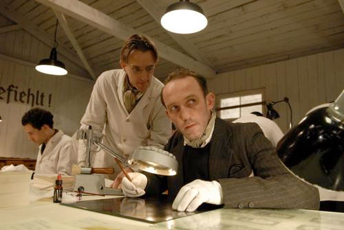 The film sketches the experience of Salomon Sorowitsch, arrested in Berlin for counterfeiting and imprisoned during the war at Sachsenhausen, where the Nazis had set up quarters for a group of print experts under Operation Bernhard, a failed scheme to flood England and America with counterfeit pounds and dollars and so collapse the national banks. Sorowitsch (Karl Markovics) is appointed project leader, and the film traces the experiences of those around him and at the center of the nefarious scheme, principally Burger (August Diehl), who wrote the story, and who was a prisoner at Sachsenhausen and who as project typographer attempted to delay the counterfeiting operation through subtle sabotage throughout the print process.