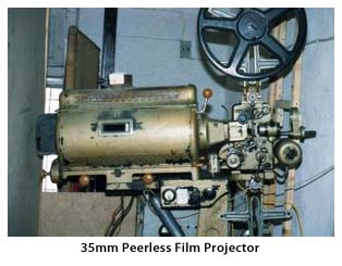 Screens used for silent movies were smaller then. The original projectors used a low intensity Peerless Carbon Arc as a light source in the lamp house. The lamp house did not originally have a mirror at the back. The projectors were unusually long because the carbon arc lamp was located at the rear in order to keep the heat away from the nitrocellulose film, which was highly flammable and potentially explosive. The projection booth walls had a four-hour asbestos pyro-block structure for fire safety. The projection booth had small windows opening to the theater through which they projected the image onto the screen. In the event of a fire, a fuse link melted, dropping a plate over the window opening. With the advent of color film, it was necessary to switch to a Peerless High intensity lamp house. The original Peerless did not have enough lumens to project color. The Wisconsin Theatre would later switch to Xenon lamp houses with 70 mm projectors, then running on a much larger screen.