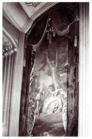 On entering the auditorium one sees a vista in Louis XIV garnished with some lines and details from the Art Deco French. This room is not the reserved silver and maroon of the lobby, but an exuberant gold and wine with accents in antique verde and teal. Both side walls have three murals "after Fragonard" with scenes of courtly capers and above each is a gilded sunburst patterned grille back lighted by hidden cove lights above, in three colors.