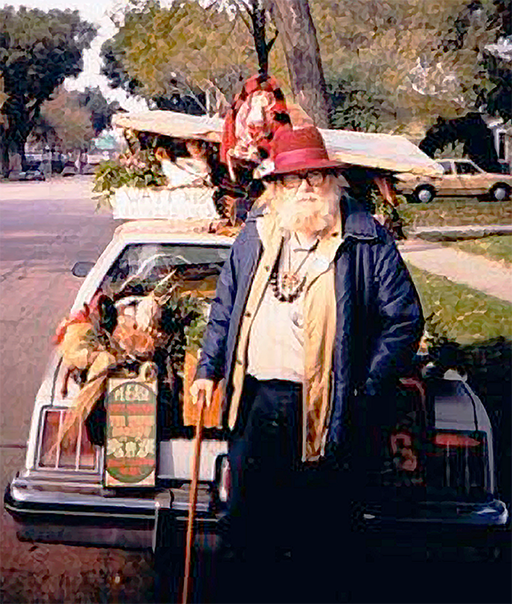 around Milwaukee in a car topped with fake fruit, flowers, dolls and anything else that met his fancy, created a sight of wonder. Were his photos devoid? Likely not in his mind. Though definitely amateurish by anyones standards, his images had a curious attraction. He liked to hand out “business” cards to young girls wanting them to pose nude. Even offered to pay up to $20 for them to model. He liked to wander into the Brady Street Pharmacy’s coffee shop spreading the photos all over a large table. That of course drew people over. Waitress Karen would stomp over to talk to me, “that dirty old man is back at it again.” Out the door he went only to be back weeks later with more photos.