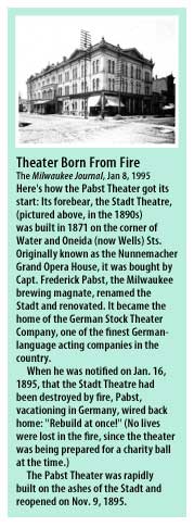 kitchen of the attached cafe and caused extensive smoke damage and the necessity of rebuilding the basement areas of the theater as well. With this need to close the theater for a time, the occasion was used to have Pabst brewery architect G. Otto Strack redesign the boxes in the auditorium to better the acoustics and sight lines, and thus this man got his first opportunity to put his mark upon this theater, even though his design for it had been rejected in 1890. The Stadt continued for two more years until finally a disastrous fire reduced all but its foundation and some of its walls to rubble in January of 1895. Preparations for a charity ball had been under way with streamers of tarlatan radiating from a chandelier of open flames, one of which ignited the streamers. Though valiantly fought in near zero temperatures, the multitude of fire companies could save only the four bays of the attached commercial and office building which was separated from the theatre by a brick firewall.