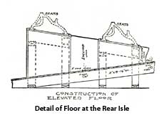 ung so as to open out. The store front is always removed and the room closed in with a partition placed about 14 feet back from the front. This gives the wide vestibule which is so necessary in an attractive place. The floor plan shows a good arrangement for an up-to-date moving picture house. Note that each aisle is marked by a small red light placed under glass in the floor. The piano pit is placed below the level of the floor to keep the player out of the line of vision. The sectional view gives a good idea of the raised floor, balcony and ticket office. It will be noticed that the three rows of seats at the rear are above the level of the main aisle.